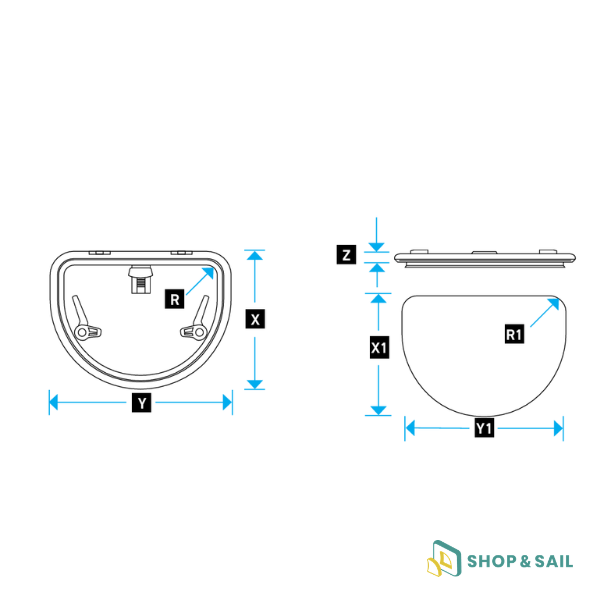 | Modèle | Référence fabricant | Intervalle charnière mm | X= Largeur | Y= Longueur | Z= Profondeur | R= Rayon | X1= Largeur découpe | Y1= Longueur découpe | R1 = Rayon de découpe | Poids (kg) | Epaisseur vitre acrylique |
