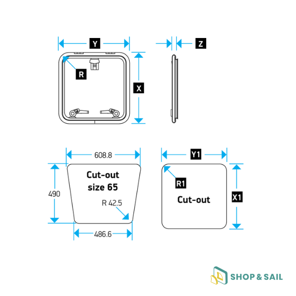 Modèle Référence fabricant W= Intervalle charnière mm X= Largeur Y= Longueur Z= Profondeur R= Rayon X1= Largeur découpe Y1= Longueur découpe R1 = Rayon de découpe Poids (kg) Epaisseur vitre acrylique T00 39900030 15 281 281 25 72.5 211 211 42.5 1.6 8 T03 39903030 15 246 301 25 72.5 176 231 42.5 1.6 8 T10 39910030 15 330 330 25 72.5 260 260 42.5 2.2 8 T20 39920030 15 272 417 25 72.5 202 347 42.5 2.3 8 T30 39930030 15 397 527 25 72.5 327 457 42.5 4.2 8 T40 39940030 15 491 491 25 72.5 421 421 42.5 4.6 8 T41 39941030 15 246 491 25 72.5 176 421 42.5 2.5 8 T44 39944030 15 512 512 25 72.5 442 442 42.5 4.8 8 T50 39950030 15 447 577 25 72.5 377 507 42.5 4.8 8 T54 39954030 15 462 577 25 72.5 392 507 42.5 4.9 8 T60 39960030 15 577 577 25 72.5 507 507 42.5 6.4 10 T65 39965030 15 560 675 25 72.5 See Drawing See Drawing 42.5 6.5 10