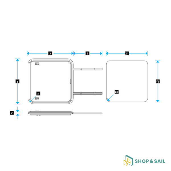 | Modèle | Référence gris | Retour du dormant sur le pont | X= Largeur | Y= Longueur | Z= Profondeur | R= Rayon | X1= Largeur découpe | Y1= Longueur découpe | R1 = Rayon de découpe | Epaisseur vitre acrylique |