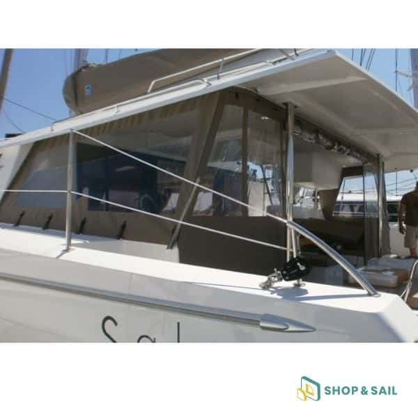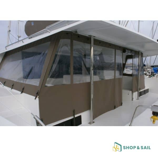Cette toile de courtoisie pour catamaran Fountaine Pajot Saba 50 permet de fermer partiellement le cockpit arrière, tout en laissant l’accès au poste de barre ouvert. Une solution idéale pour créer un espace de vie abrité et lumineux, sans encombrer la descente de cockpit. Fermeture de descente disponible en option.