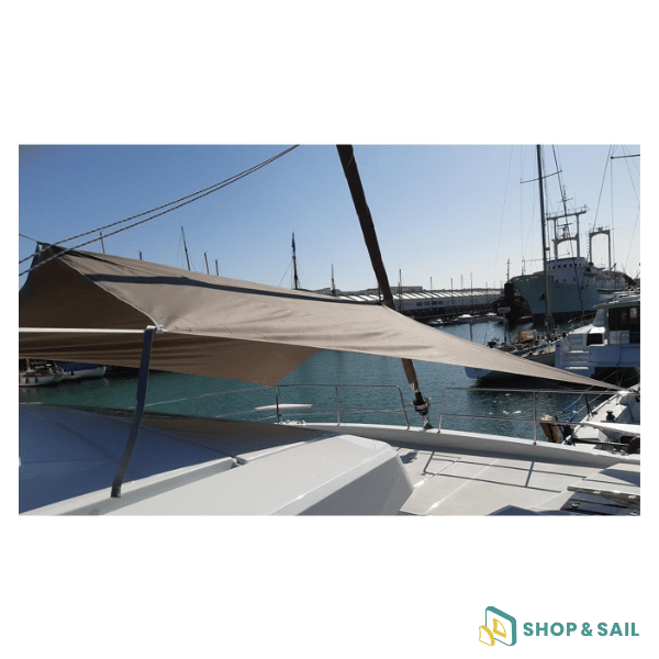 Positionnée à l’avant, elle crée une zone ombragée agréable, réduisant significativement la chaleur dans les espaces de vie extérieurs et améliorant le confort à bord lors des mouillages ou des navigations en plein soleil.