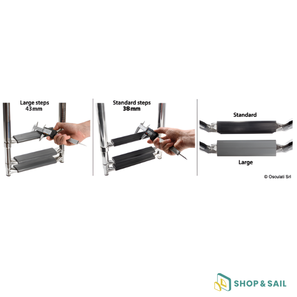 Le design télescopique permet une utilisation efficace de l’espace tout en offrant une flexibilité accrue. Une fois repliée, l’échelle se fait discrète sur la plateforme, préservant ainsi l’esthétique globale de votre bateau tout en restant immédiatement opérationnelle pour vos moments de baignade en mer. Les marches majorées de 43 mm offrent un confort supérieur sous le pied, sécurisant chaque montée et descente.