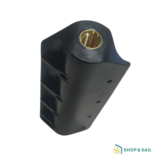 - Boîtier côté guindant : équipé d’un filetage M10 en laiton, il permet de se visser directement sur un chariot. Sa fixation se fait à l’aide de 2 x 4 vis, assurant une parfaite tenue sur la voile.